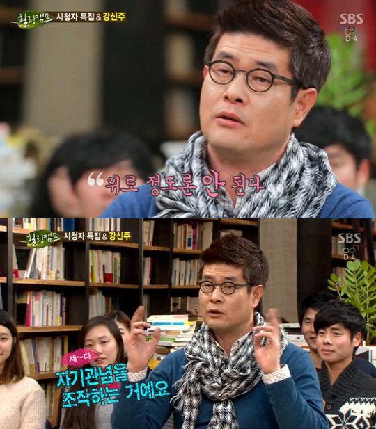 이날 강신주는 MC 성유리와 김제동은 물론, 결혼을 위해 맞선을 60번 봤지만 성공하지 못한 여성, FD 출신 배우 지망생, 은퇴를 앞둔 아버지가 가족에 집착해 고민인 여성 등 방청객들이 털어놓는 고민에 대해 직설 화법으로 조언을 하는 등 유쾌하고 뭉클한 감동을 선사했다.
