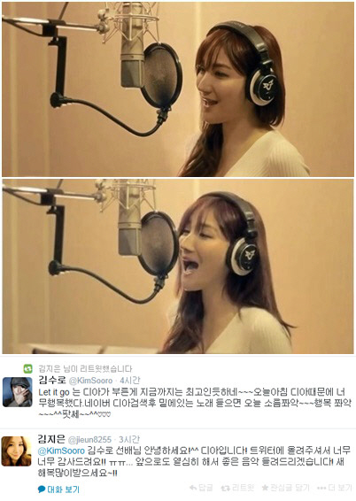 이에 디아는 "김수로 선배님 안녕하세요. 디아입니다. 트위터에 올려주셔서 정말 감사드려요. 앞으로도 열심히 해서 좋은 음악 들려드리겠습니다. 새해 복 많이 받으세요"라며 감사의 뜻을 전했다.