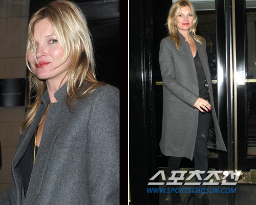 이날 케이트 모스는 회색 코트에 검정색 상하의로 심플하면서도 시크한 패션을 선보였다.