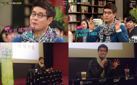 3일 방송된 SBS '힐링캠프'에 출연해 화제를 모은 철학자 강신주. 그가 연신 특유의 돌직구 화법을 이어가고 있다.