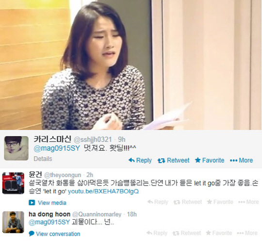 특히 가수 신승푼은 자신의 트위터에 "역시 손승연!"이라는 글을 게재했으며, 윤건도 트위터를 통해 "설국열차 화통을 삶아먹은 듯 가슴 뻥 뚫리는. 단연 내가 들은 let it go 중 가장 좋음. 손승연 'let it go'"라며 극찬했다.