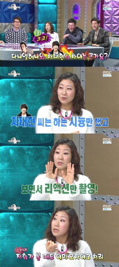이후 MC들이 '다니엘 헤니와 차태현의 차이는 크냐?'는 질문에 라미란은 "차태현은 소변보는 시늉만 했고 다니엘 헤니는 찍어놓은 걸 보면서 리액션만 촬영했는데 우리가 볼 때도 이미 모자이크 처리가 돼 있었다"고 아쉬운 듯 말해 스튜디오를 발칵 뒤집었습니다.