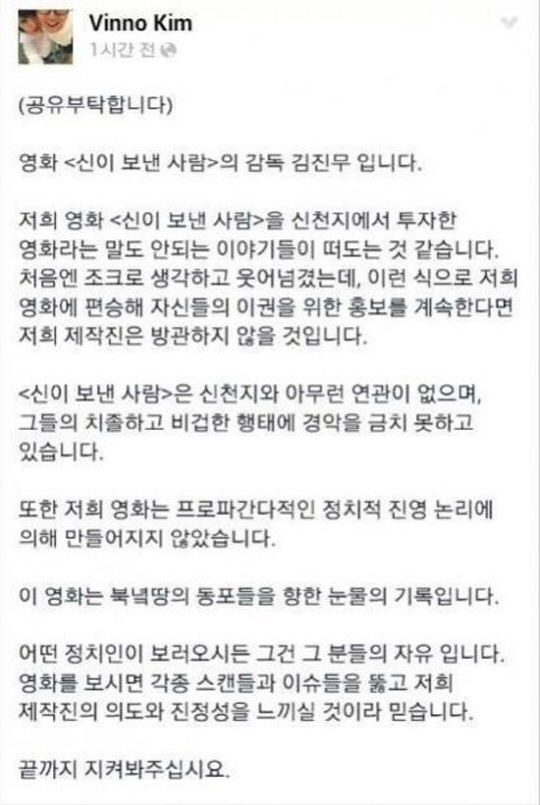 김 감독은 "'신이 보낸 사람'을 신천지에서 투자한 영화라는 말도 안 되는 이야기들이 떠도는 것 같습니다"며 "처음엔 조크로 생각하고 웃어 넘겼는데 이런 식으로 저희 영화에 편승해 자신들의 이권을 위한 홍보를 계속 한다면 제작진은 방관하지 않을 것"이라고 밝혔다.