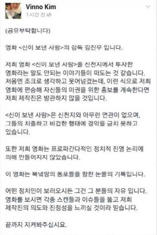이어 그는 "'신이보낸사람'은 신천지와 아무런 연관이 없으며 그들의 치졸하고 비겁한 행태에 경악을 금치 못하고 있다"며 "이 영화는 북녘 땅의 동포들을 향한 눈물의 기록이다. 영화를 보시면 각종 스캔들과 이슈들을 뚫고 제작진의 의도와 진정성을 느끼실 것"이라고 강조했다.