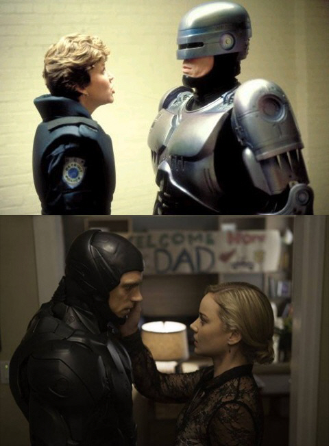 반면 새로운 '로보캅'에서는 가족애와 인권을 전면에 배치했다. 경찰권이 민간기업에 넘어가는 일은 일어나지 않고 '로보캅'과 그의 가족들이 기업에 의해 헤어지게되는 부분을 부각시킨 것. 사실 로봇이 경찰이 되면 인간 경찰은 모두 일자리를 잃게 될텐데도 그런 걱정은 보이지 않는다. 대신 전작과 다르게 가족애을 전면 배치해 아들을 만나고 싶어하는 사이보그 아버지 알렉스 머피(조엘 킨나만)로 관객에게 어필하려 한다.