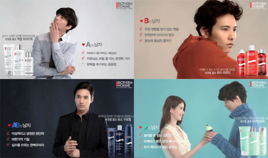 원빈은 비오템 광고에서 소심한 A형 남자에게는 적극적으로 다가가고, 자기중심적인 B형 남자에게는 취미를 함께 하며, 차가운 AB형 남자들에게는 시크하게, 무난한 O형 남자들에게는 애교 작전으로 펼치라는 등 혈액형별 성향을 고려한 방법을 제안했다.
