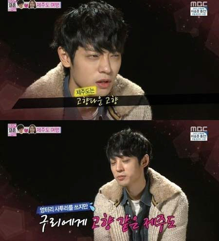 또 정준영은 "'나 오늘 돈 주웠는데 이따 밥 먹을래?'는 뭔 줄 아느냐"고 물은 뒤, "'나 오늘 동 봉갔는데 밥 먹언?'이다"며 제주도 사투리로 능숙하게 말해 이목을 쏠렸다.