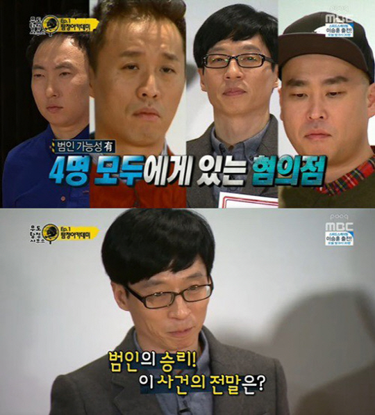 용의자 4명은 여관주인은 유재석, 가수 홍진영의 남자친구 박명수, 옆방 투숙객 길, 야식 배달부 정준하로 결정됐다. 용의자들은 진술카드를 뽑고 나머지 세 명의 탐정은 진술을 듣고 범인을 찾았다.
