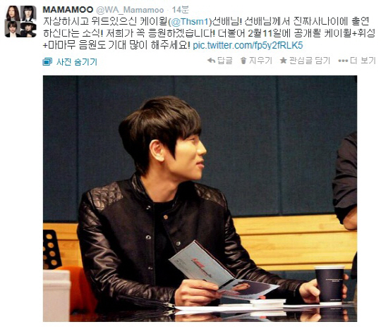4시간 후 또 한번 공식 SNS를 통해 '자상하시고 위트있으신 케이윌 선배님! 선배님께서 진짜사나이에 출연하신다는 소식! 저희가 꼭 응원하겠습니다! 더불어 2월11일에 공개될 케이윌+휘성+마마무 음원도 기대 많이 해주세요!'라는 글과 함께 사진이 공개되었다.