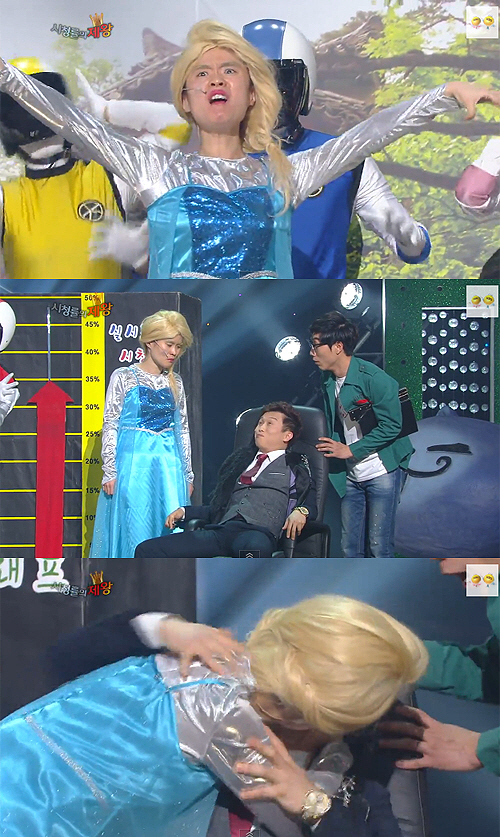 애니메이션 '겨울왕국'의 OST 'Let it go'에 맞춰 등장한 박지선은 금발 가발에 파란색 드레스를 입고 나타나 특유의 돌고래 소리를 냈다.