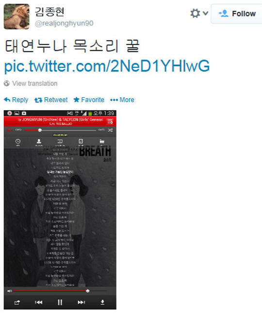 특히 종현은 이날 음원이 공개된 후 자신의 트위터에 "태연누나 목소리 꿀"이라는 글과 함께 SM 더 발라드의 신곡 '숨소리'가 재생되고 있는 사진을 게재해 눈길을 끌었다.
