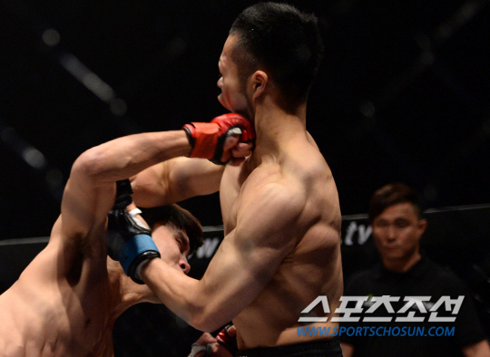9일 오후 서울 송파구 방이동 올림픽공원 올림픽홀에서 '로드FC014 대회'가 열렸다. 윤형빈은 일본의 츠쿠다 타카야와 한일전 경기를 펼쳤다. 윤형빈이 타카야에게 1라운드 TKO승을 거뒀다. 오른손 카운트 펀치로 KO승을 거두고 있는 윤형빈(왼쪽). 방이동=송정헌 기자 songs@sportschosun.com/2014.02.09