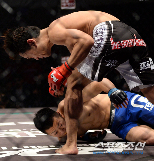 9일 오후 서울 송파구 방이동 올림픽공원 올림픽홀에서 '로드FC014 대회'가 열렸다. 윤형빈은 일본의 츠쿠다 타카야와 한일전 경기를 펼쳤다. 윤형빈이 타카야에게 1라운드 TKO승을 거뒀다. 윤형빈이 강력한 오른손 카운트 펀치로 KO승을 거두고 있다. 쓰러져 있는 타카야를 가격하고 있는 윤형빈. 방이동=송정헌 기자 songs@sportschosun.com/2014.02.09