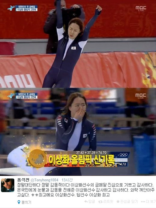 방송인 홍석천은 12일 자신의 트위터를 통해 "정말 대단하다. 정말 감동적이다. 이상화선수의 금메달 진심으로 기쁘고 감사하다. 온 국민에게 눈물과 감동을 전해준 이상화 선수 감사하고 감사하다. 와락 껴안아주고 싶다. 최고에요 이상화 선수. 탑선수 이상화 최고"라며 이상화의 금메달 소식에 기뻐했다.