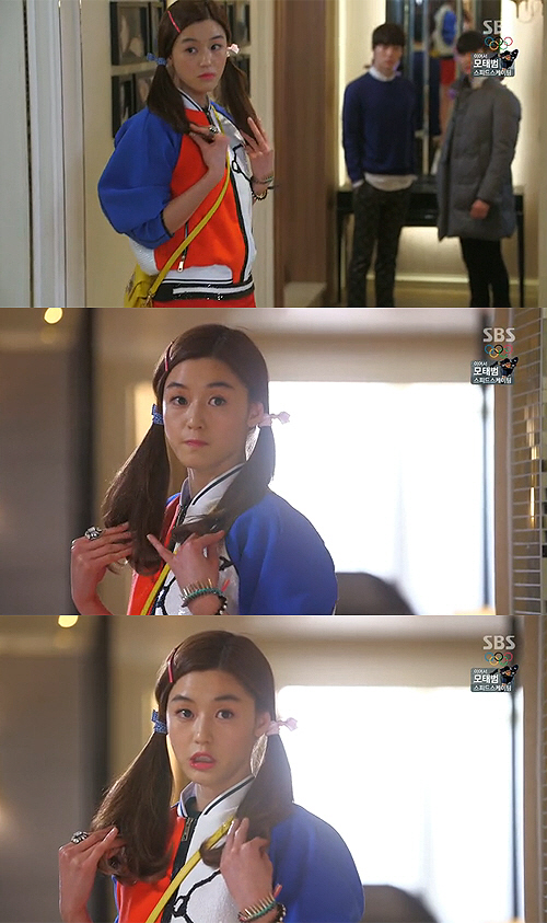 이후 도민준은 천송이를 촬영장에 데려다 주기 위해 집을 찾았다. 도민준과 동생 천윤재(안재현)의 재촉에 방에서 나온 천송이는 양 갈래 머리를 만지작거리며 귀여운 표정을 지은 채 최대한 어려 보이려고 노력했다.