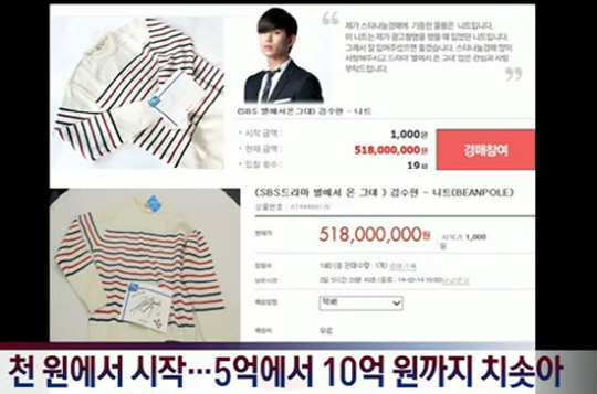이에 11일 1000원으로 시작된 김수현 니트 경매는 12일 오전 한 때 5억 1800만 원을 기록하는 진풍경을 보였다. 하지만 이는 오류가 있었던 것으로 13일 현재 650만 원대를 기록하고 있다.