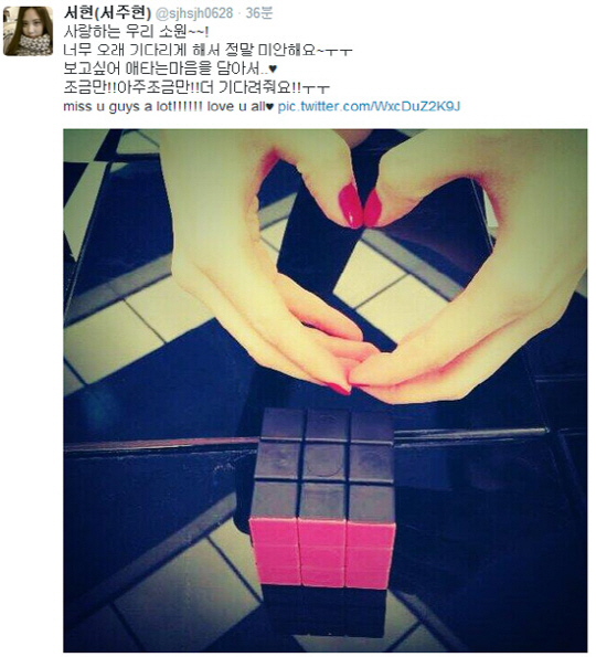 서현은 14일 자신의 트위터를 통해 "사랑하는 우리 소원~! 너무 오래 기다리게 해서 정말 미안해요~보고싶어 애타는마음을 담아서..조금만! 아주 조금만! 더 기다려줘요"라는 글과 함께 손으로 하트 모양을 그린 사진 한 장을 게재했다.