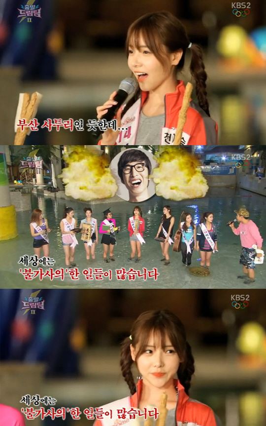 경기에 앞서 여성 출연진은 자기를 소개하는 시간을 가졌고, 천이슬은 다소 어색한 사투리를 써가며 자신을 부산 아가씨로 소개했다.