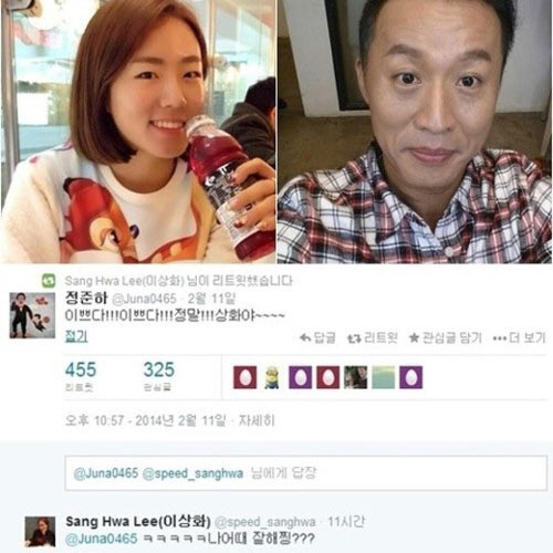 이에 정준하 역시 자신의 트위터에 "예쁘다 정말 예쁘다 상화야"라며 이상화의 금메달에 축하의 멘트를 날렸고, 이에 이상화는 "나 어때 잘했찡?"이라며 답글을 남기며 두 사람의 인연이 관심이 쏠렸다.