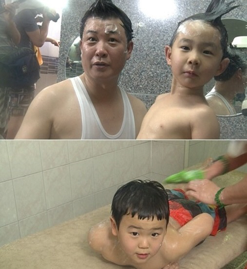 이날 아빠와 아이들은 서로 때를 밀어주고 머리를 감겨주는 등 친밀한 모습으로 화기애애하게 목욕을 했다.