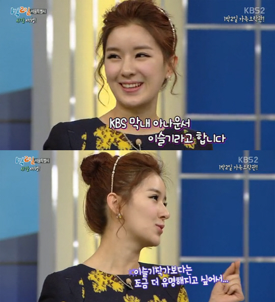 이슬기 아나운서는 자기소개를 하며 "'1박2일' 이슬기 작가보다 조금 더 유명해지고 싶다"고 말햇다.