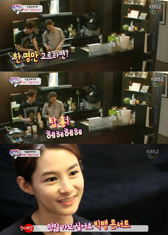 이날 아침을 준비하던 강혜정은 "나도 빅뱅 오빠들 만나고 싶다"고 말했다. 이에 타블로는 "빅뱅오빠들 누구?"라며 물었고, 강혜정은 "탑 형"이라고 말하며 웃어보였다.