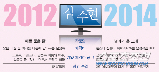 따라서 '해품달' 김수현과 '별그대' 김수현의 가상 대결을 결론부터 말하자면, 2014년 김수현의 우세승이다. 앞서 언급한 것처럼 무게감있는 광고 모델로 몸값을 더욱 높인 데다가, 해외팬들까지 등에 업게 됐기 때문이다. 2012년 김수현은 국내 시장용이었다면, 이젠 해외 프리미엄까지 더하게 된 것.