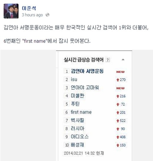 이와 함께 이준석은 유명 포털사이트의 실시간 급상승 검색어 1위부터 10위까지 나온 화면을 캡처해 게재했다. 해당 게시물에는 1위 '김연아 서명운동', 6위 'first name'이 순위에 올라와 있다.
