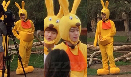 호주 현지에서 찍힌 김우빈의 모습은 귀여운 캥거루 코스튬. 김우빈이 아기 주머니까지 강조된 호주 캥거루 변신 사진은 현지 팬들과 중국 웨이보 등 SNS로 확산중이다.