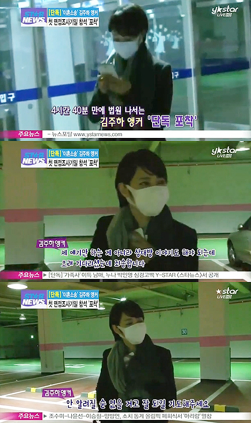 24일 방송된 Y-STAR '생방송 스타뉴스'에서는 지난 13일 면접조사기일에 참석하기 위해 서울가정법원에 출두한 김주하 앵커의 모습을 단독 포착했다.