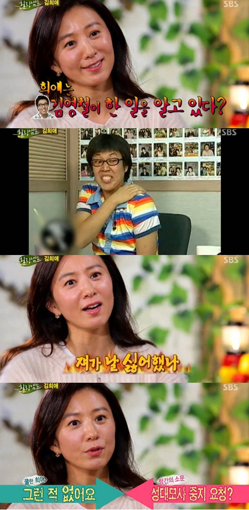 이날 방송에서 MC 이경규는 "김희애편에 김영철이 성대모사 하는 장면을 자료화면으로 써도 되겠나?"고 질문을 던지자, 김희애는 "마음대로 해라"며 쓴 웃음을 지었다.