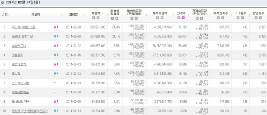 지난 20일 개봉한 두 영화는 박빙의 승부를 펼치고 있다. '찌라시'는 개봉 당일 9만여명을 동원하며 '겨울왕국' '수상한 그녀'의 기존 투톱을 제치고 1위로 출발했다. 이?날도 1위를 지켰지만 주말 '폼페이'에 1위 자리를 내줬다. 개봉관 수('찌라시' 490관, '폼페이' 486관)도 엇비슷해 초 접전 양상은 당분간 이어질 전망이다.