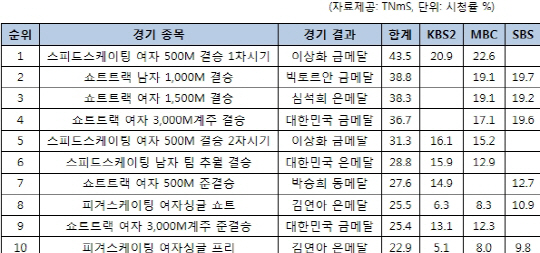 시청률 조사기관 TNmS은 25일 소치올림픽 시청률을 결산해 발표했다. TNmS는 '지난 7일 저녁 개막식을 시청률 합계 9.3%로 시작했고, 가장 시청률이 높았던 중계 방송은 이상화가 금메달을 딴 스피드 스케이팅 여자 500M 결승 1차 시기(43.5%), 러시안 빅토르안이 금메달을 딴 쇼트트랙 남자 1,000M 결승전(38.8%), 심석희가 은메달을 딴 쇼트트랙 여자 1,500M 결승(38.3%) 시청률 순이었다'고 공개했다. 이어 '피겨여왕 김연아가 출전한 피겨 스케이팅 여자싱글 경기는 새벽 시간대에 중계방송 되었음에도 불구하고 쇼트 프로그램 시청률은 25.5%(8위), 프리 스케이팅은 22.9%(10위)로 상대적으로 높은 시청률을 기록했다'고 발표했다. 또한 '김연아의 시청률 합계는 쇼트 프로그램 32.1%, 프리 스케이팅 29.2%로 소치 올림픽 이전 동 시간대 시청률보다 무려 20배 높은 수치'라고 설명했다. 상대적으로 얼마나 늦은 시간대에 경기가 펼쳐졌느냐에 따라 시청률 차이가 날 수 밖에 없었다는 분석. 한편 소치올림픽 폐막식 시청률 합계는 4.5%로 집계됐다.