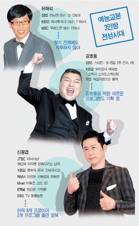 예능가를 삼등분한 유재석-강호동-신동엽의 장기집권. 2014년에도 '유강신의 시대'는 여전히 계속되고 있다. 수많은 도전과 변화의 바람 속에 때때로 '예전만 못하다'며 위기론에 시달리기도 하지만, 최고의 예능 MC, 예능신(神)이라는 지위는 흔들리지 않았다.