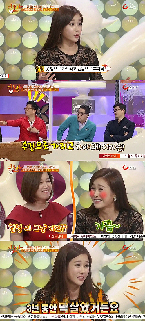 이 밖에도 현영은 남자 출연진들에게 "결혼하고 나서 아내가 샤워한 후 맨몸으로 방으로 가는 건 어떠냐"며 조심스레 물었다.