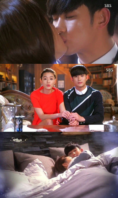 도민준은 "내가 다 파진 거 입고 쏘다니고 그러지 말랬지?"라며 "그래. 나야. 나라고. 미안해. 너무 늦었지?"라고 말하며 눈물 흘리는 천송이와 진한 키스를 했다.