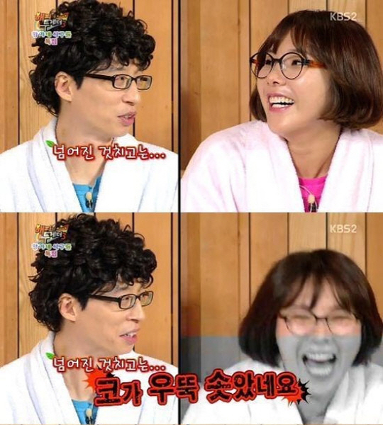특히 이날 본격적인 대화에 앞서 출연진들은 신봉선의 코에 시선을 모았다. MC 박미선은 "신봉선이 넘어져서 코가 부었나보다"라고 우회적으로 이야기했고, MC 유재석 역시 "봉선 씨는 새해 결심했던 일을 드디어 했다. 코가 우뚝 솟았다"며 신봉선의 코 성형 수술 사실을 폭로했다.