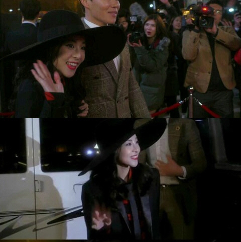 검은색 의상에 챙이 넓은 모자를 쓰고 모습을 드러낸 산다라박은 붉은 입술로 도도한 매력의 여신으로 깜짝 변신했다.