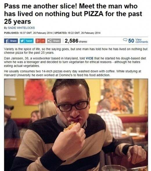 미국 지역 일간지 볼티모어 선은 25일(현지시간) 메릴랜드 주에 거주하는 목세공 댄 얀센이 매일 지름 14인치(약 36cm) 피자를 먹는다고 전했다.