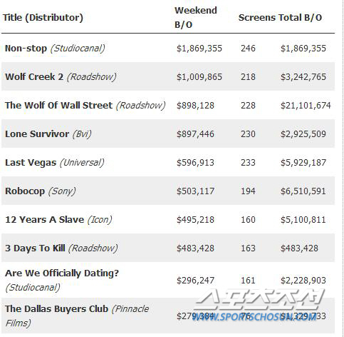 뿐만 아니라, 호주 박스오피스 전문 사이트인 mumbrella.com은 "영화 '논스톱'이 개봉 첫 주말 호주 246개 스크린에서 상영, 총 186만 9천불의 수익을 올려 박스오피스 정상에 올랐다. 리암 니슨의 스릴러 영화 '논스톱'은 218스크린에서 상영, 100만불을 갓 넘긴 수익을 올린 호주 영화 'Wolf Creek 2'을 2위로 밀어내며 첫 박스오피스 1위를 차지했다" 고 밝히며 '논스톱'의 호주 박스 오피스 1위 소식을 알렸다.
