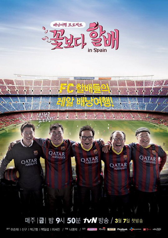 사진에는 축구장을 배경으로 FC 바르셀로나 유니폼을 입고 어깨동무한 '꽃할배' 이순재, 신구, 박근형, 백일섭과 '국민짐꾼' 이서진이 환한 미소를 짓고 있는 모습이 담겨 있다.