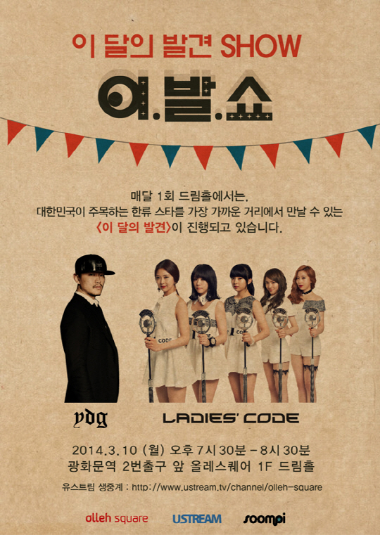 한편 양동근과 레이디스 코드가 함께하는 '이달의 발견' 미니콘서트는 유스트림(http://www.ustream.tv/channel/olleh-square)을 통해 190여 개국 에 생중계 되며, '이달의 발견' 티켓은 온라인 예매 사이트 인터파크 티켓을 통해 1000원에 구입할 수 있다.
