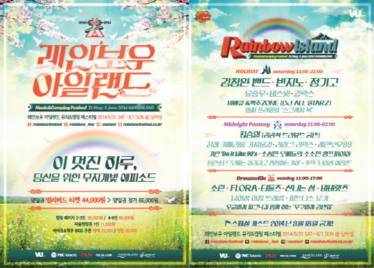 한편 '레인보우 아일랜드 2014 뮤직&캠핑'의 티켓은 12일부터 인터파크, 예스24에서 예매할 수 있다. 이정혁 기자 jjangga@sportschosun.com