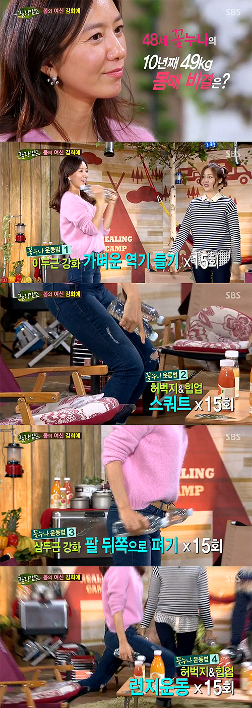 김희애는 3일 방송된 SBS '힐링캠프, 기쁘지 아니한가'에서 10년째 49kg 몸매를 유지하는 운동 비법을 설명했다.