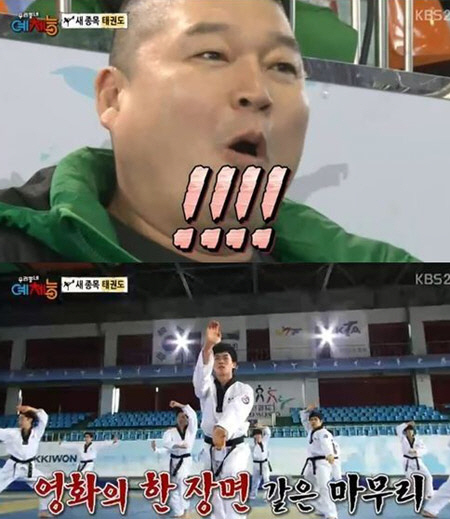 강호동은 "우리가 영화 속에 들어와 있는 것 같다"며 절도 넘치는 시범단의 품새 시범을 극찬했다.또한 멤버들은 공중 3단계 격파와 360도 돌려차기 격파 등의 시범을 보고 놀라움을 금치 못했다. <스포츠조선닷컴>