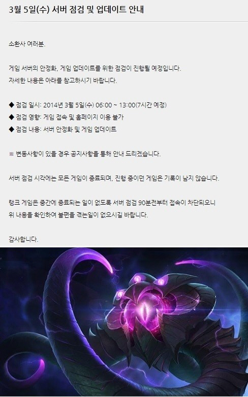 이번 롤 점검을 위해 오전 4시 30분부터 랭크 큐, 로그인 큐 비활성화를 순차적으로 진행했고, 오전 6시에는 서버를 완전히 닫았다.