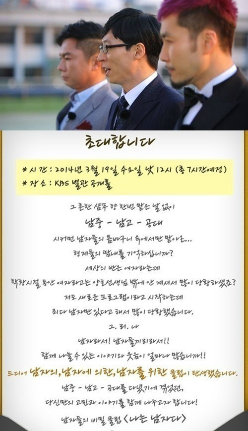 4일 KBS 2TV 파일럿 예능프로그램 '나는 남자다' 제작진은 공식 홈페이지를 통해 MC 유재석의 이름으로 '나는 남자다' 초대장을 공개해 관심을 모으고 있다.