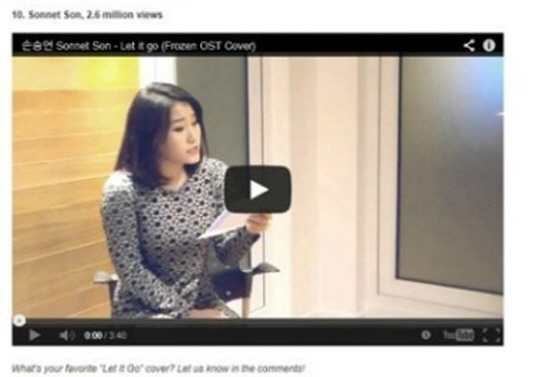 이 가운데 손승연이 열창한 '렛잇고' 영상은 총 270만 이상의 조회수를 달성하며 국내 가수로는 유일하게 10위 권 안에 이름을 올리는 기염을 토했다.