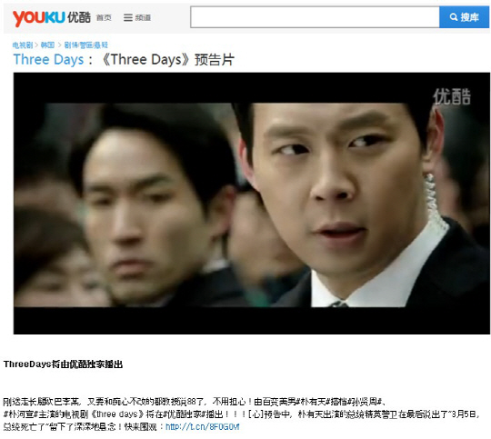 '쓰리데이즈'의 판권을 구매한 곳은 중국 최대 동영상 사이트 유쿠(youku). 중국 내에서 가장 많은 가입자와 접속자 수를 자랑하는 곳인 만큼 '쓰리데이즈'가 시작되면 중국 내 또 한 번 강력한 한류가 휘몰아칠 전망이다.