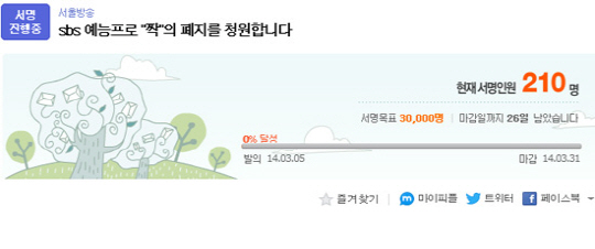 SBS 커플 매칭 프로그램 '짝'에 출연 중이던 한 여성 출연자 A(29·여)씨가 사망하며 논란이 일고 있는 가운데, 한 포털 사이트 게시판에서는 '프로그램 폐지 서명 운동'이 진행 중이다.